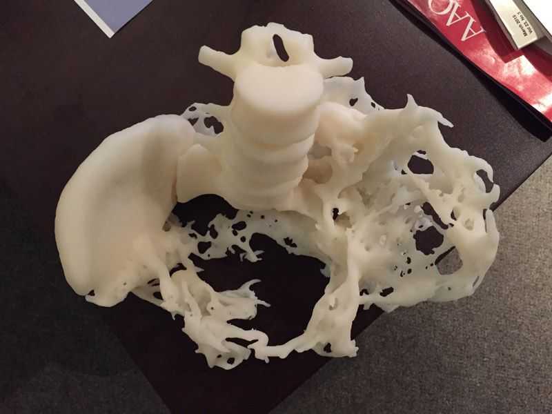 "This patient had a very severe blast injury and sustained the highest level of amputation of any survivor from the previous two conflicts. Heterotopic ossification, a kind of maladaptive healing response, formed all along his residual pelvis and perineum. This is a model we made from the patient's CT scan using a 3D printer that prints in resin."